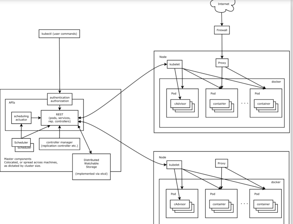 主要由以下几个核心组件组成: apiserver 所有服务访问的唯一入口,提供认证、授权、访问控制、API 注册和发现等机制 controller manager 负责维护集群的状态,比如副本期望数量、故障检测、自动扩展、滚动更新等 scheduler 负责资源的调度,按照预定的调度策略将 Pod 调度到相应的机器上 etcd 键值对数据库,保存了整个集群的状态 kubelet 负责维护容器的生命周期,同时也负责 Volume 和网络的管理 kube-proxy 负责为 Service 提供 cluster 内部的服务发现和负载均衡 Container runtime 负责镜像管理以及 Pod 和容器的真正运行 |