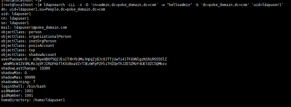 ldapsearch -LLL -x -D 'cn=admin,dc=poke_domain,dc=com' -w "helloadmin" -b 'dc=poke_domain,dc=com' 'uid=ldapuser1' |