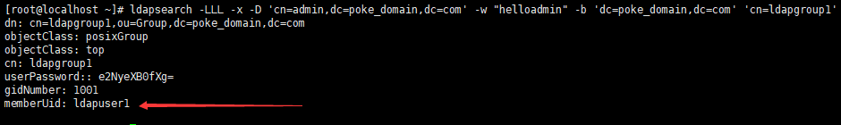 ldapsearch -LLL -x -D 'cn=admin,dc=poke_domain,dc=com' -w "helloadmin" -b 'dc=poke_domain,dc=com' 'cn=ldapgroup1' |